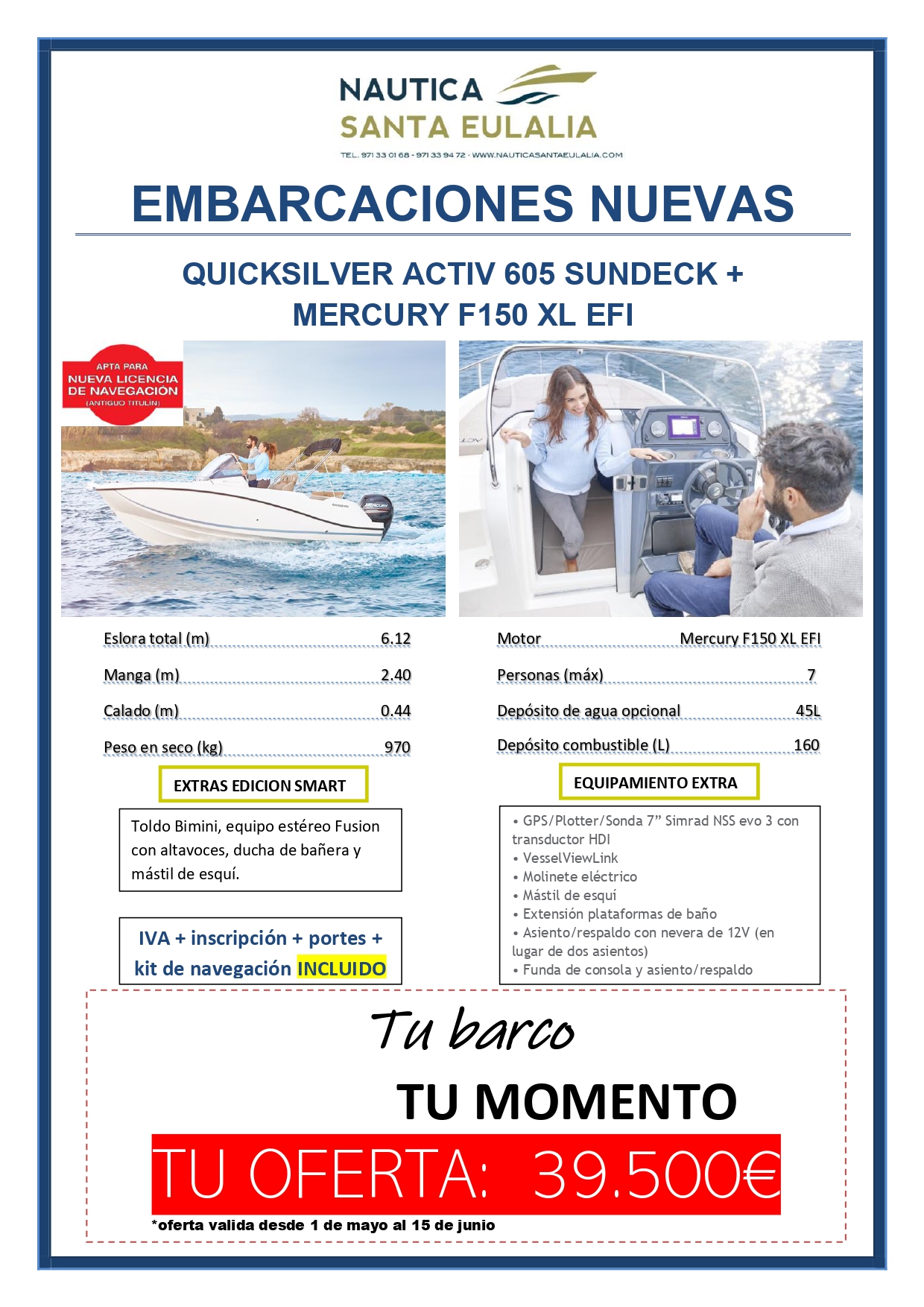 ¡Aprovecha esta oportunidad única y haz tu pedido con Quicksilver ahora! Disfruta de descuentos de hasta 5.863€ y compra el barco que siempre has soñado.